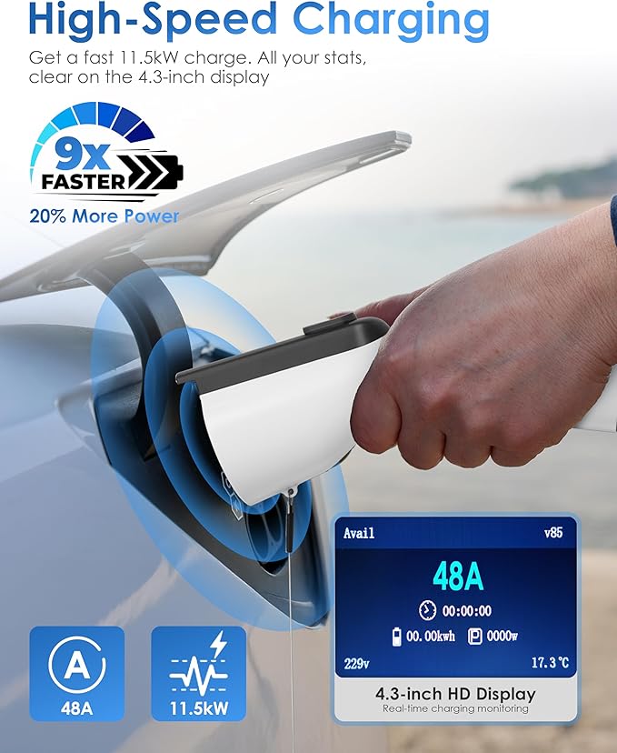 Level 2 EV Charger 48 Amp- 11.5kW 240V Hardwired Wall Charger for Home with 4.3" LCD, 26ft Cable, Scheduled Charging & Wall Holder, SAE J1772 Connector