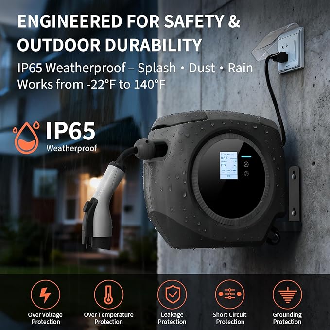 - 【Multiple security authentications】Electric ev charger Certified with UL and FCC for safety, and IP65 dustproof & waterproof rating. Features 5 core safety protections: overvoltage, short circuit, overtemperature, leakage, and ground protection. Works in temperatures from -22°F to 140°F, making it perfect for both indoor and outdoor use, even in rain or snow.