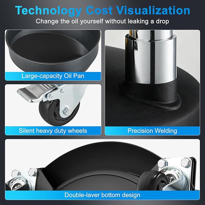 - Adjustable Height with Secure Mobility: Adjust funnel height from 51.5 to 65 inches in seconds via quick-release valve for all vehicle types, 360° swivel casters (2 locking) ensure smooth workshop navigation and stable positioning during operation
