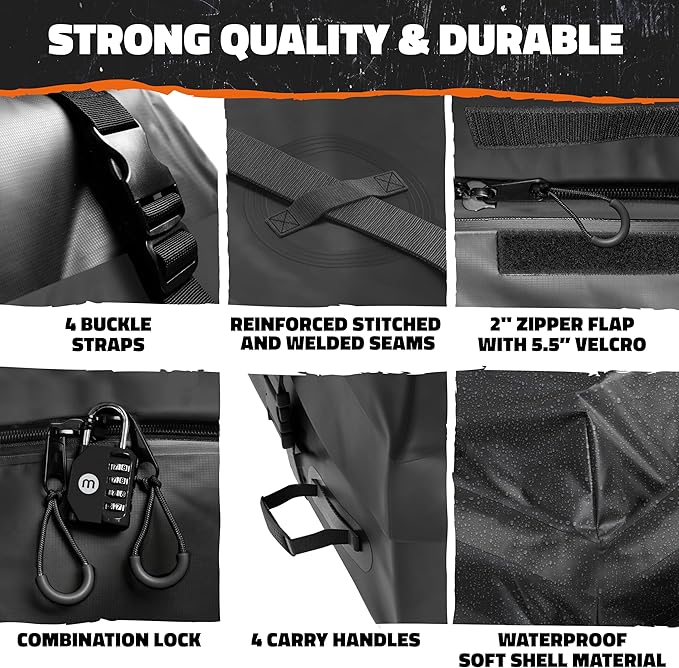 - INCLUDES ROOFTOP CARGO BAG : The Mockins 16 Cu Ft. (45"x34"x18") Waterproof Cargo Bag for top of car is made from durable, abrasion-resistant vinyl, providing all-weather performance. Our vehicle soft shell carriers feature a protective zipper flap with Velcro closures to keep cargo secure. Along with its spacious, foldable design, the car roof bag includes 4 side handles & easy-to-use zipper pulls. Cargo always stays protected with this cartop carrier waterproof bag, ideal for every journey.