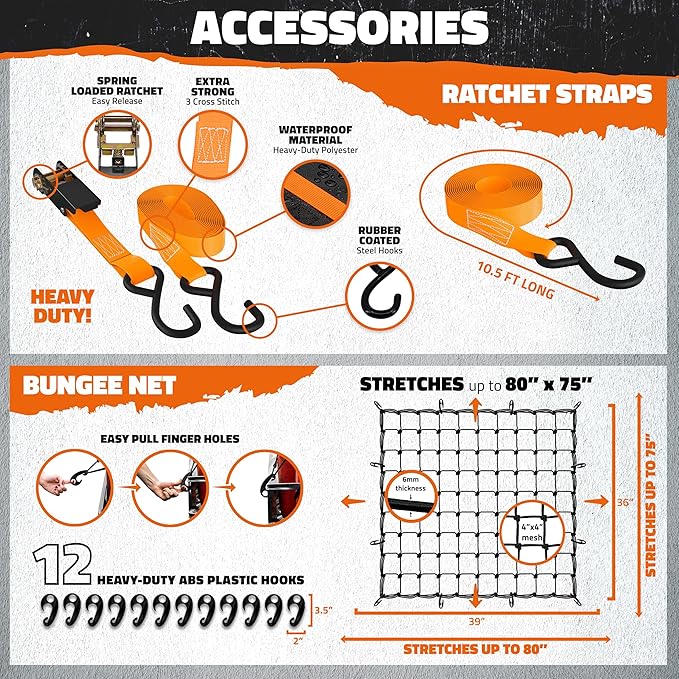 - TOTAL CAR ROOF BASKET CARGO CARRIER KIT: The set comes complete with a heavy-duty roof rack basket cargo carrier , a roof rack bag , 4 buckle straps, 2 ratchet straps, a cargo net, combo lock & carry bag. Easily secure the cargo roof rack using the buckle straps & ratchet straps with spring-loaded latches. The expandable net stretches from 39"x35" to 80"x75" & fits firmly on the car roof basket with 12 ABS hooks. Plus, the included lock keeps items safe inside the car top cargo carrier bag.