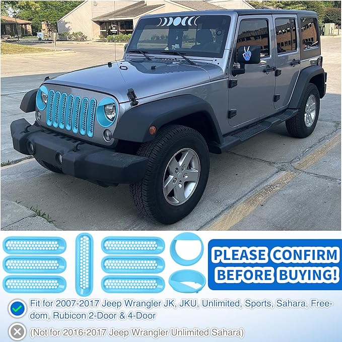 - GRILL INSERTS COMPATIBILITY: Nilight blue front grille mesh inserts & headlight cover fit for Jeep Wrangler JK, JKU, Unlimited, Sports, Sahara, Freedom, Rubicon 2-Door & 4-Door 2007 2008 2009 2010 2011 2012 2013 2014 2015 2016 2017 2018. Note: Not fit for 2016-2018 Sahara, Sahara X, Rubicon X, Polar Edition, Dragon Edition, Altitude Edition 2015-2018, Back Country Edition and 75th Anniversary Edition. Please confirm your car model before purchasing