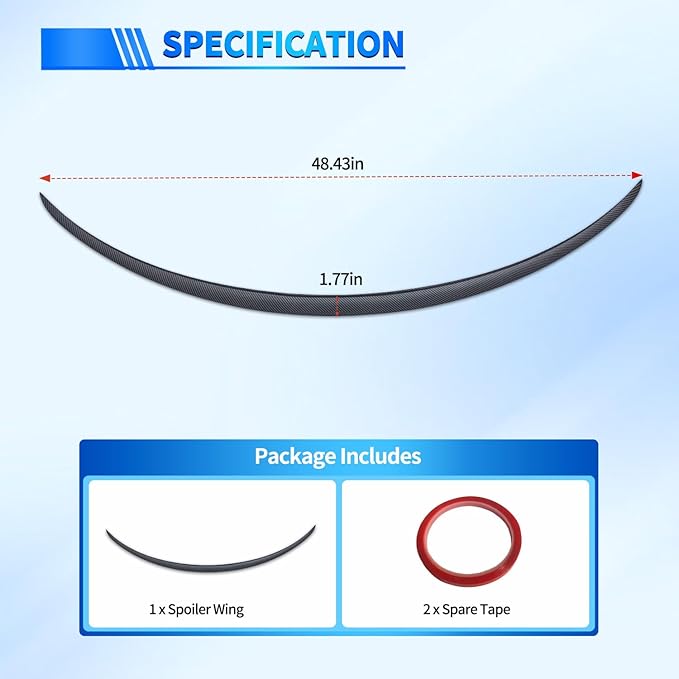 - PREMIUM MATERIAL: The rear spoiler measures 48.43 inches in length and 1.77 inches in width. Made of high-quality, high-strength ABS material, it features a carbon fiber pattern finish, offering a clean and attractive look while providing excellent durability, UV resistance, and lightweight strength. It can withstand various weather conditions, is waterproof and abrasion-resistant, and will not crack, fade, or deform