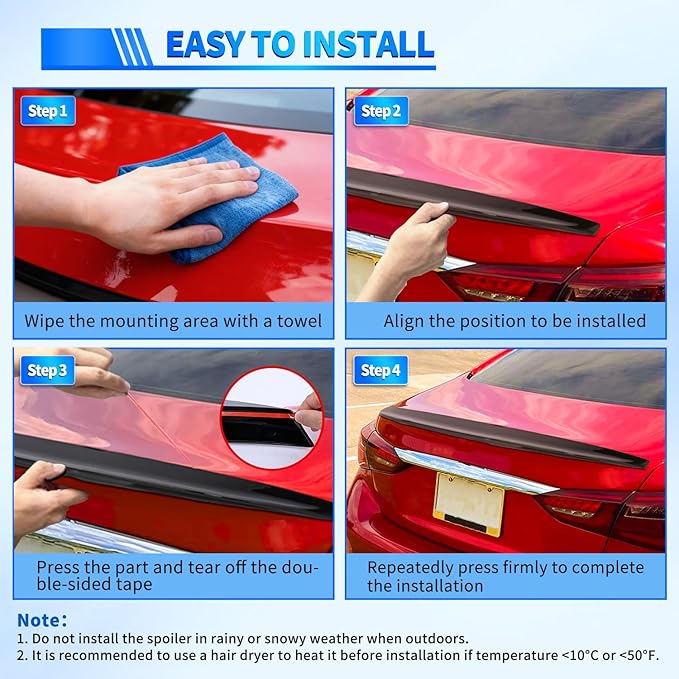 - INSTALLATION TIPS: 1. Do not install the spoiler outdoors in rain or snow. 2. If the temperature is below 10°C or 50°F, it is recommended to use a hairdryer to heat the area before installation. 3. Do not get it wet within 48 hours of application
