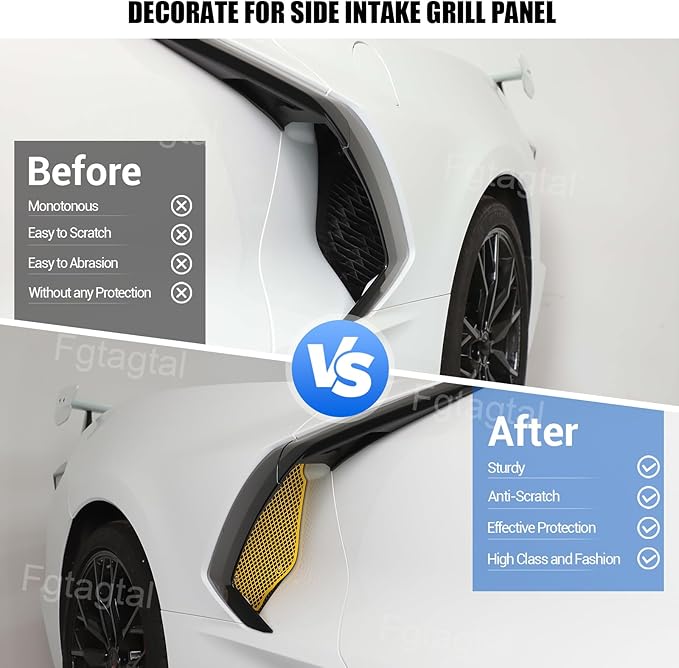 - 【APPLICABLE MODELS】: The side radiator grille guards compatible with Chevrolet Corvette C8 2020 2021 2022 2023 2024 2025, Not work for Corvette C8 Z06/E-ray 2023-2025 version! The size of the original car is customized.