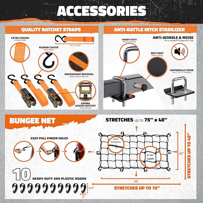 - No More Loose Cargo: The Mockins Trailer Hitch Storage Rack Bundle includes 2 heavy-duty, 10-foot ratchet straps with spring-loaded latches for stable, adjustable attachment to your travel trailer hitch basket . This car hitch cargo carrier set also comes with a 6mm cargo net that stretches from 36"x20" up to 75"x40". Equipped with 10 ABS plastic hooks with built-in finger holes, fastening it over your hitch luggage rack is easy & quick. The set also works seamlessly as an RV cargo carrier .