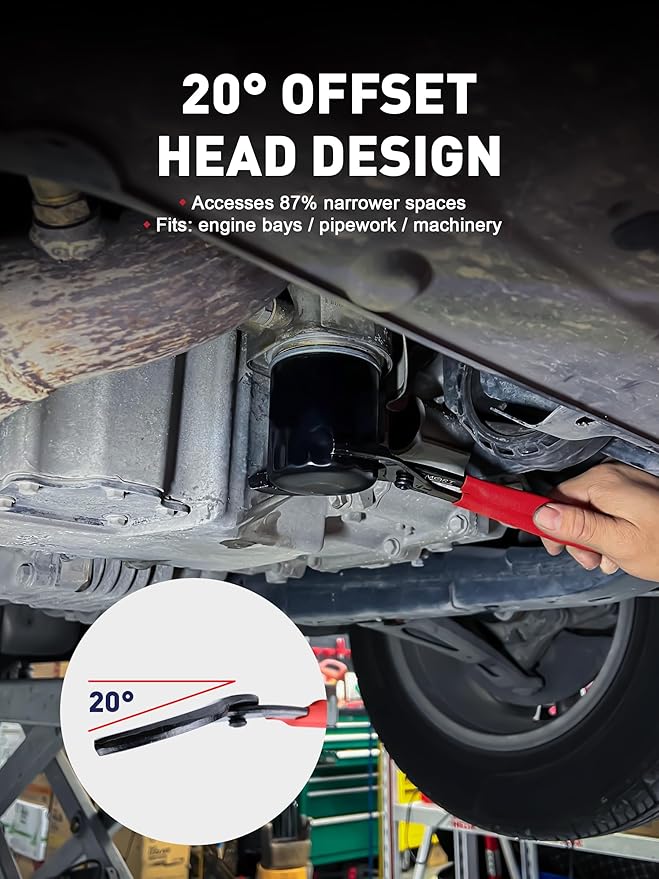 - 20° Angled Head Accesses 87% of Hard-to-Reach Spaces: The strategically angled head allows you to effortlessly reach oil filters in confined engine bays, behind pipework, and in other tight machinery spaces, fitting 87% of narrower scenarios where straight tools fail