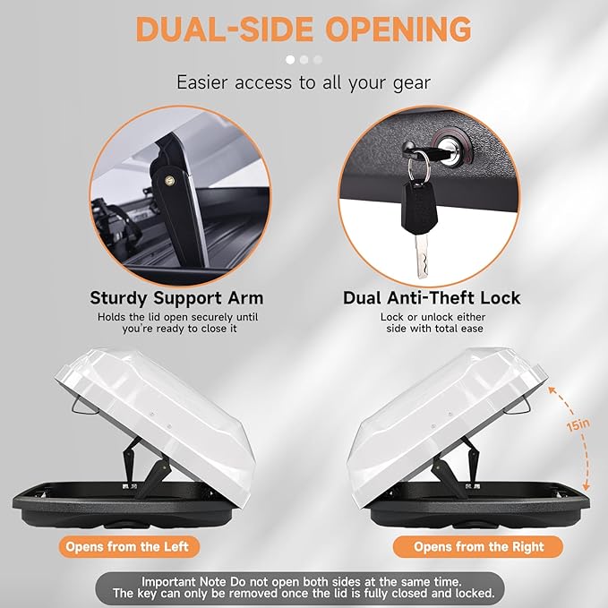 - CONVENIENT SIDE OPENING WITH SUPPORT ARM: The box opens on the passenger side with a 15-inch-wide opening, making it easy to load bulker items from the side. A strong support arm keeps the lid open upon lifting, staying securely in place until you close it manually