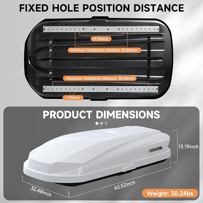 - SPACIOUS CAPACITY WITH HIGH LOAD LIMIT: Measuring 62.52 inches long by 32.48 inches wide and 13.19 inches high, this cargo box provides 14 cubic feet of storage space. It holds up to 130 pounds, allowing you to carry a wide range of gear securely