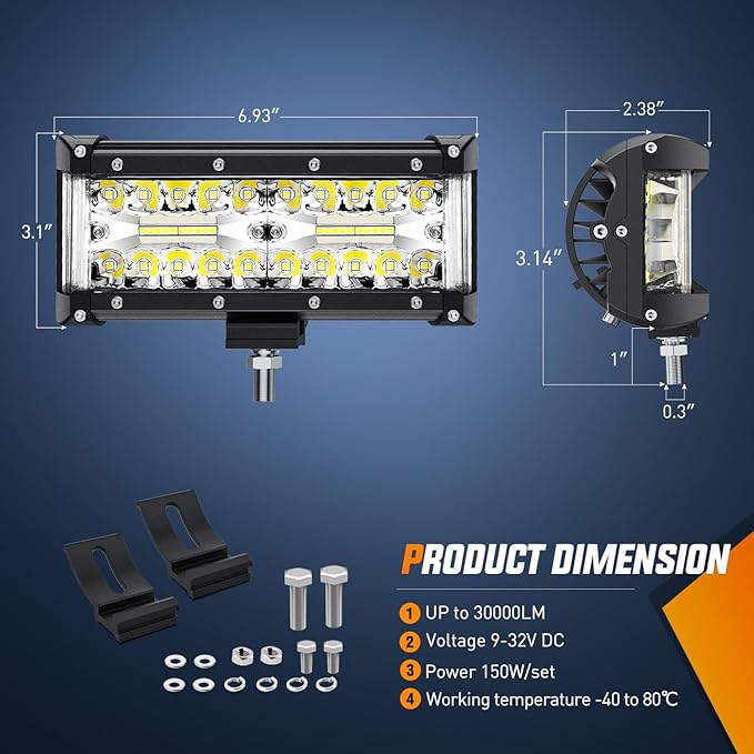 - Super Bright Brightness: 150W pod lights, combination of 50 pcs superior-quality chips emit 5800-6000k bright white light, higher light transmission rate polycarbonate lenses - reduce optical loss, delivering 30000 lumens and ensuring that objects far clearly visible to prevent potential threats, offering you an unparalleled driving experience